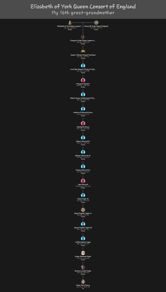 Elizabeth of York’s life symbolizes the end of the Wars of the Roses and the beginning of Tudor England. Her marriage brought peace to England, her offspring shaped future dynasties, and the legacy of her bloodline lived on through her children—even amidst later Tudor-era conspiracies. I am greatful to be able to say she is my 16th great grandmother.