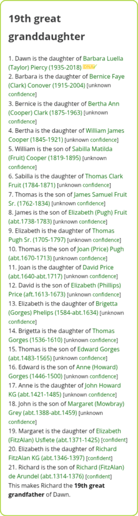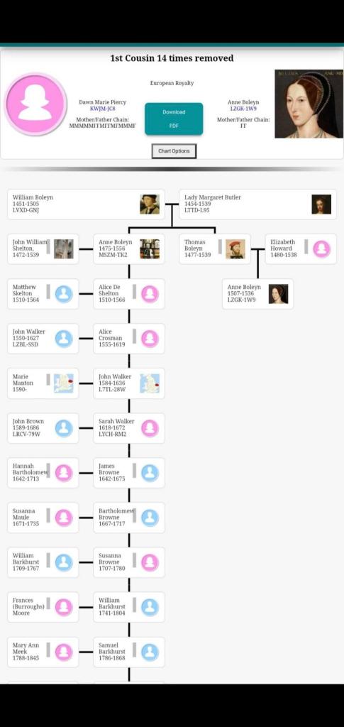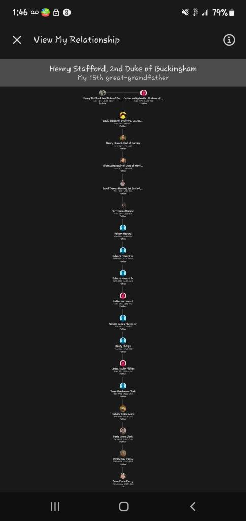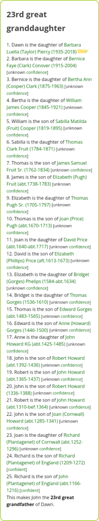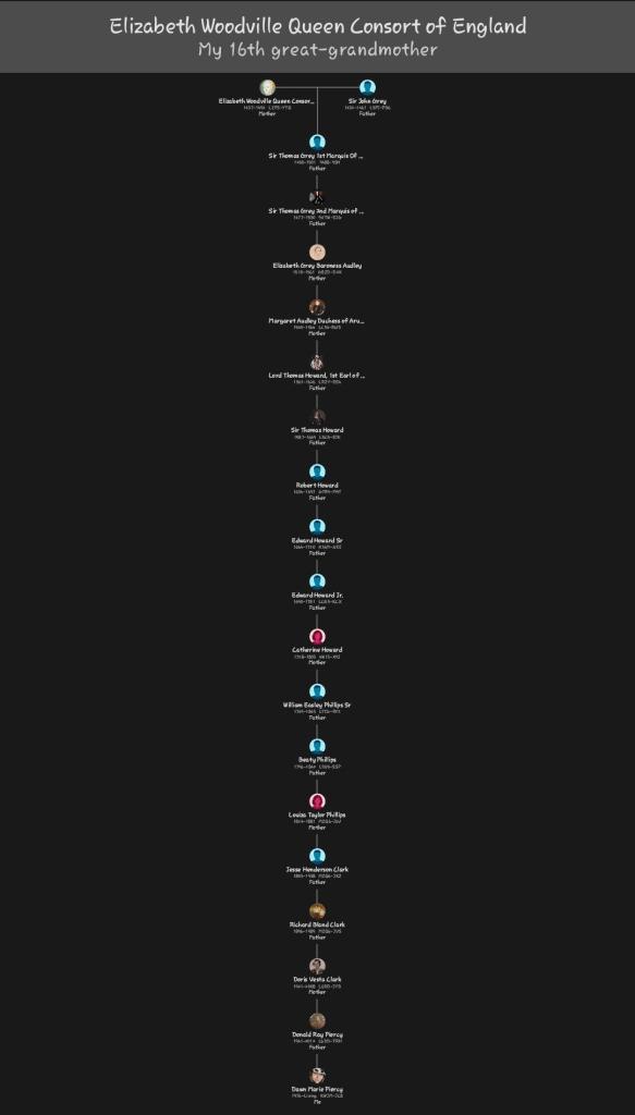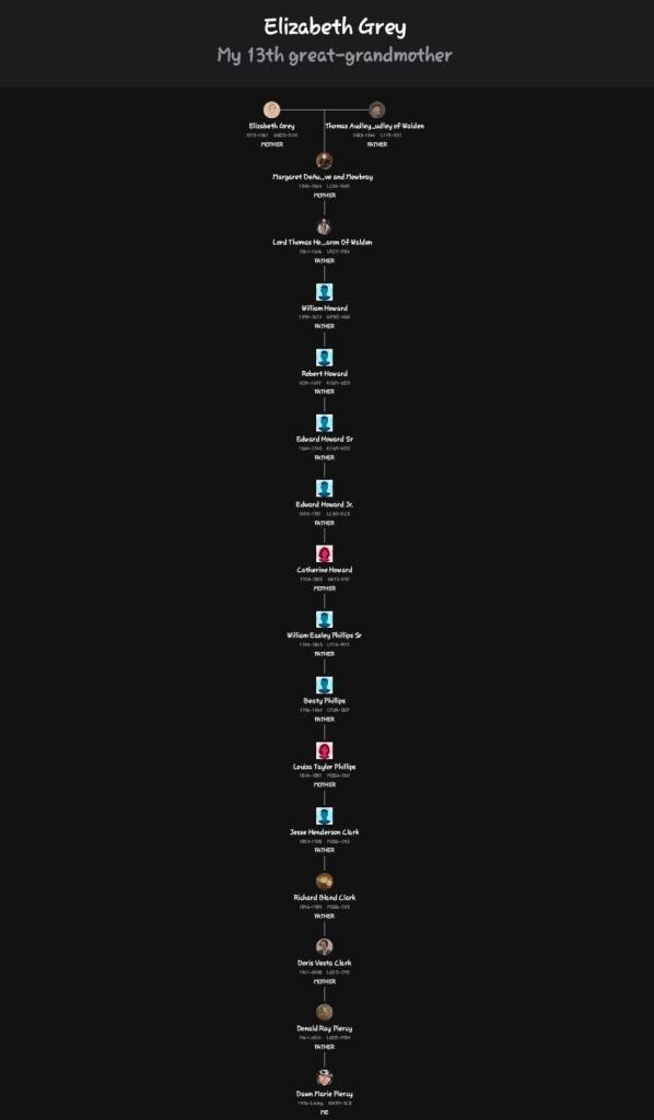 Then Elizabeth Grey married Thomas Audley, and their line eventually connects directly to you, making: